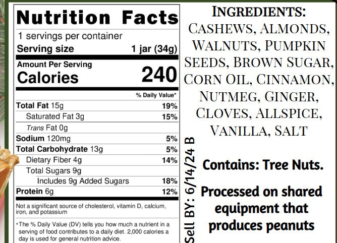 Pumpkin isn't only for the fall! Taste the cozy flavors of fall even when the leaves are gone and snow is falling with our Pumpkin Pie Nut Butter. although it's cold outside this blend of warm spices and delicious nuts is sure to warm you right up! enjoy it on toast, in oatmeal, baking or right from the jar this gourmet nut butter is a pumpkin lover's dream come true in a jar!